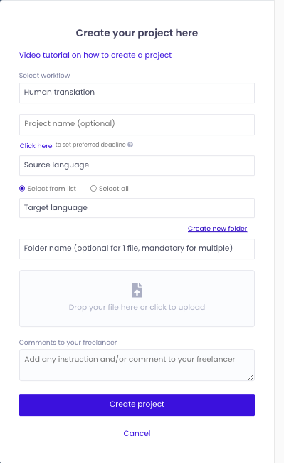 Folder name: If you want to place the project in a folder, you can select it in this drop down menu. It shows all your current folders. Please note that if you upload more than one file at the same time, you need to select or create a folder to be able to create the project. You can see more about working with folders here.