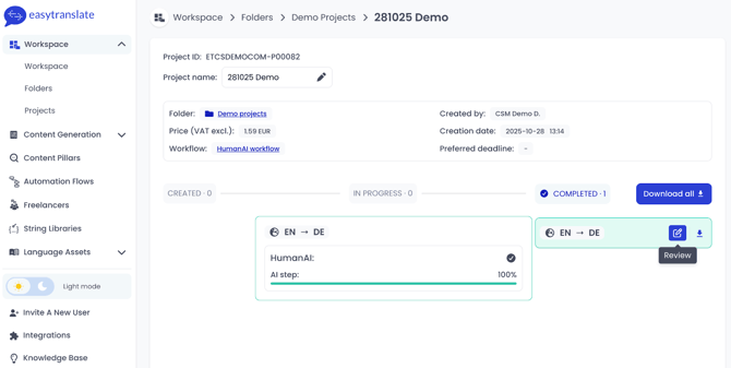 In addition, your edits help train and fine-tune the AI system connected to your HumanAI workflow. Over time, this leads to refinedtranslations, faster turnaround, and fewer repetitive corrections. The more you review and adjust, the smarter and more aligned the system becomes with your team’s linguistic standards.