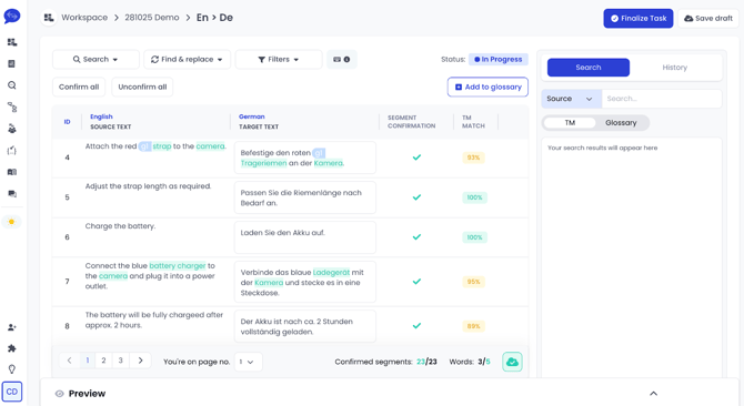 The internal review editor gives you full control over refining and implementing preferential changes to your final translations. It provides a dedicated space to check terminology, style, and context before you download the final translation. Any adjustments you make are automatically saved to the translation memory, ensuring that your preferred wording and terminology are consistently applied in future projects.
