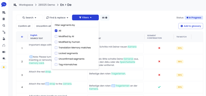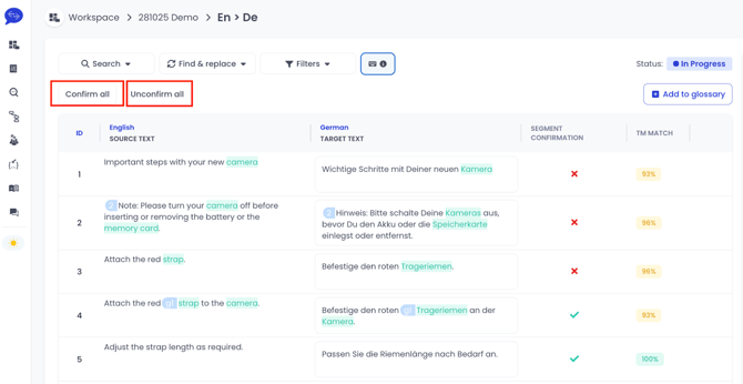 To bulk edit segments, click on Confirm all or Unconfirm all segments.