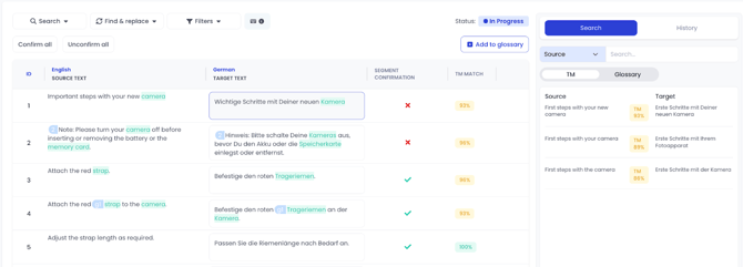 This feature allows you to further increase consistency across your translations or to rephrase the translation and optimize for SEO purposes. You can search for translation memory matches in either the source or target text. Read more about translation memory and how to manage them via the language assets HERE.