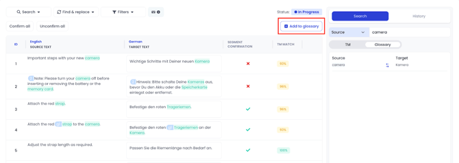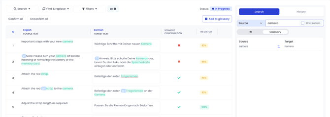 When selecting Search and Glossary you can look for terms that are part of the connected glossary. Select the strict search if you only want to see full matches from the glossary. In addition the green highlighted terms within the segments are indicating that that term is part of the connected glossary.