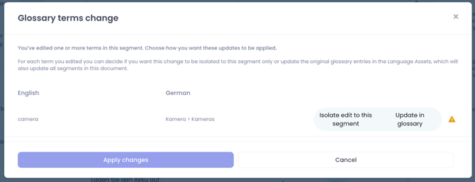 Assuming your user account has the necessary permissions you can edit existing glossary entries (highlighted in green) or add new terms to a glossary from within the internal review editor.. If you change an existing entry the Glossary terms change dialog box will open upon segment confirmation. You can choose to either implement the change isolated to this specific segment or to adjust the glossary entry in the connected language asset.