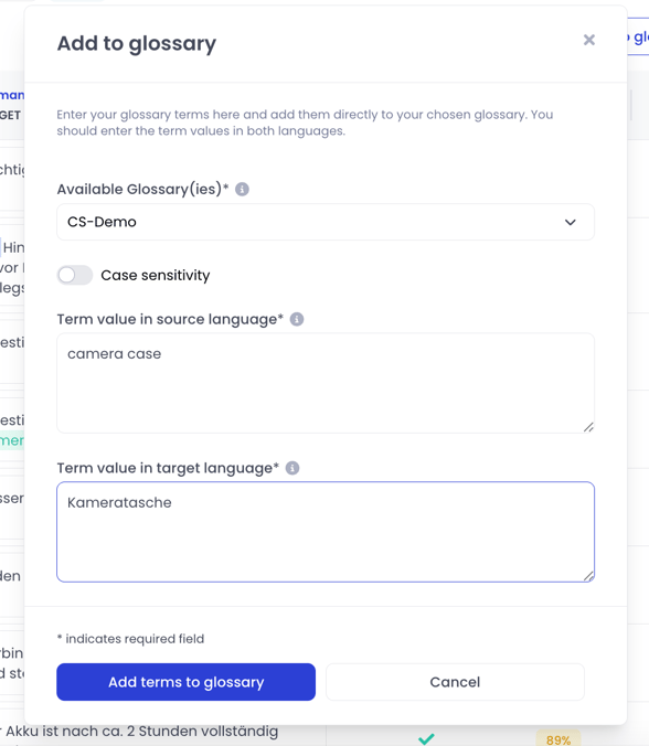 Select the glossary you would like to add this term to, choose if it should be case sensitive and enter the desired translation. To finalize, click on Add terms to glossary.