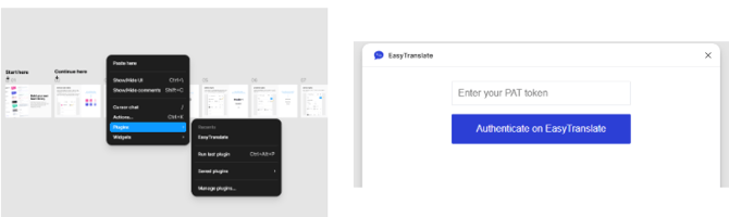 Once installed you need to authenticate the plugin to be allowed to send information between EasyTranslate and Figma. To do so right click on your canvas and proceed to Plugins -> EasyTranslate. This opens a dialog where you are prompted to enter your Personal Access Token (PAT) which you can find in the EasyTranslate account you would like to connect to.