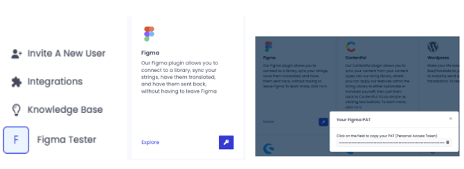 To retrieve it, log in to EasyTranslate, click on Integrations on the bottom left and find the Figma plugin in the selection. Click on the key icon to reveal the PAT and copy it.