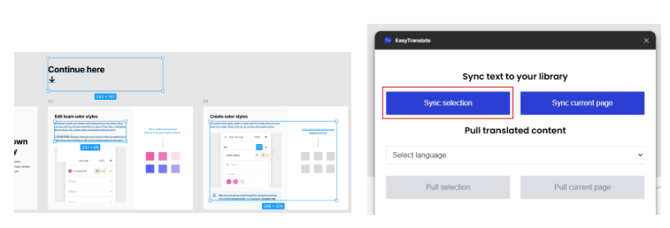 Use this function if you wish to pull specific portions of text to a given page. This is relevant if you are adding new content to an existing page or are updating existing texts. On the respective page, select the text segments you would like to include in the pull, open the app and choose the language you would like to add. Finally, proceed by clicking Pull selection. This will pull the translation of all selected text fragments (=text in an individual text box in Figma) to your Figma page. See an example HERE.