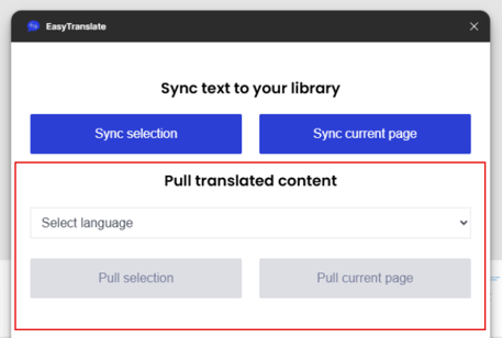 If you wish to pull all content to a given page make sure the app is connected. Choose the language you would like to pull into your designs. The system lets you choose between all available languages - both source and target. Clicking on Pull current page will overwrite the synchronised content on this page with translations in the chosen language. See an example HERE.
