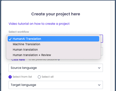Once the training of the AI system is completed for the selected languages, HumanAI Translation will be available on your account. You will then be able to select it as a workflow from your familiar EasyTranslate create project interface.
