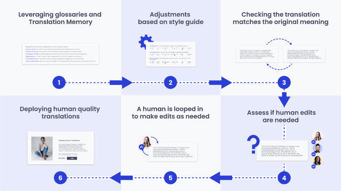 To set you up we assign one of our dedicated AI training specialists to your account. They collaborate closely with language leads to provide you with a highly customized and validated ready-to-use setup. Once the output has reached human quality and adheres to your linguistic and brand requirements the account is ready to go live.