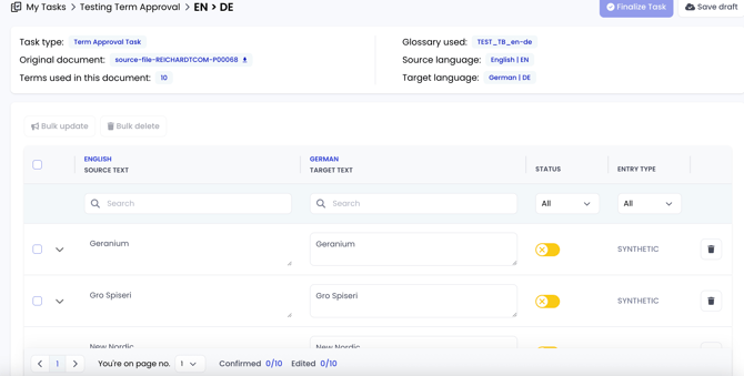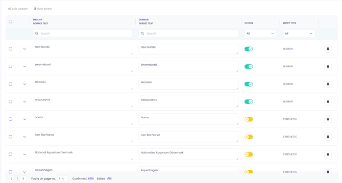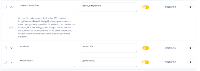 To edit an extracted and translated term listed in the SOURCE TEXT column, you simply write in the TARGET TEXT segment and approve it by clicking the toggle on the right, which will then turn green. This action will also change the entry type from SYNTHETIC to HUMAN.