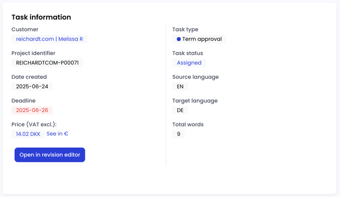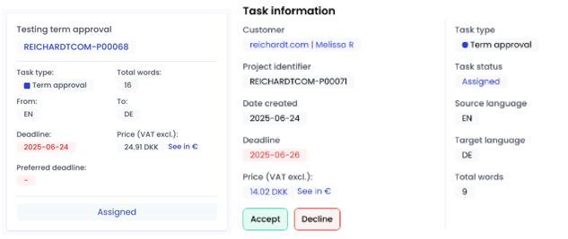 Term approval tasks are assigned and accessed in the same way as all other tasks on the EasyTranslate platform. Once a new project becomes available you receive an email notification and the task will be listed on your dashboard. You can access the assignment by clicking on the task card. This will open a detailed view providing information such as deadline and price. It's also here where you have to either accept or decline your task