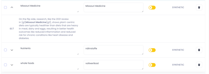 To edit a term, you simply write in the term's target entry’s segment and approve it by clicking the toggle on the right, which will turn green. This action will also change the entry type from synthetic to human.