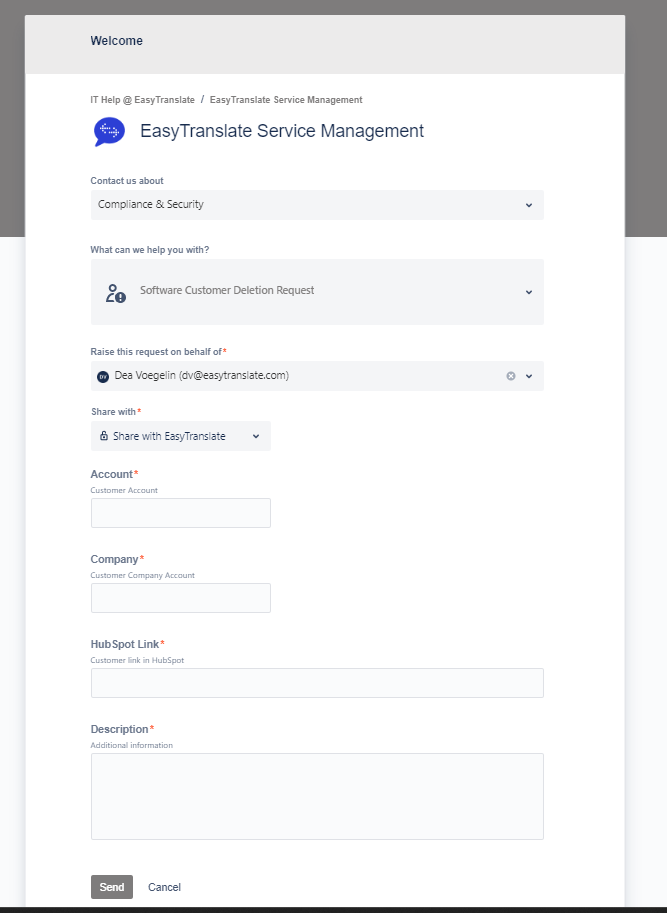 NB: Company subsidiaries are not considered the same company. - If a customer is sending a request for deletion via email, make sure to forward the message to support@easytranslate.com, so we have the request in HubSpot and the support team can start the deletion process.