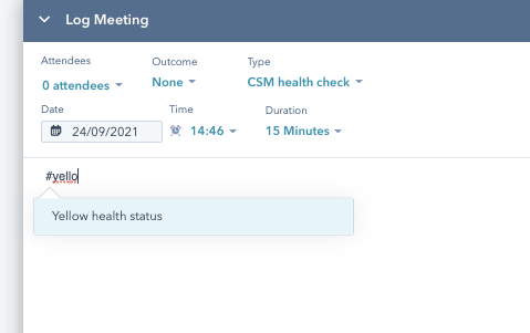 Go on the customer in Hubspot, under the "Meetings" tab click "Log meeting". under "Type" select "CSM health check". Add attendes and outcome etc. In the description field type # + the relevant health colour to insert the relevant snippet text for the meeting (Red, Green, Yellow).