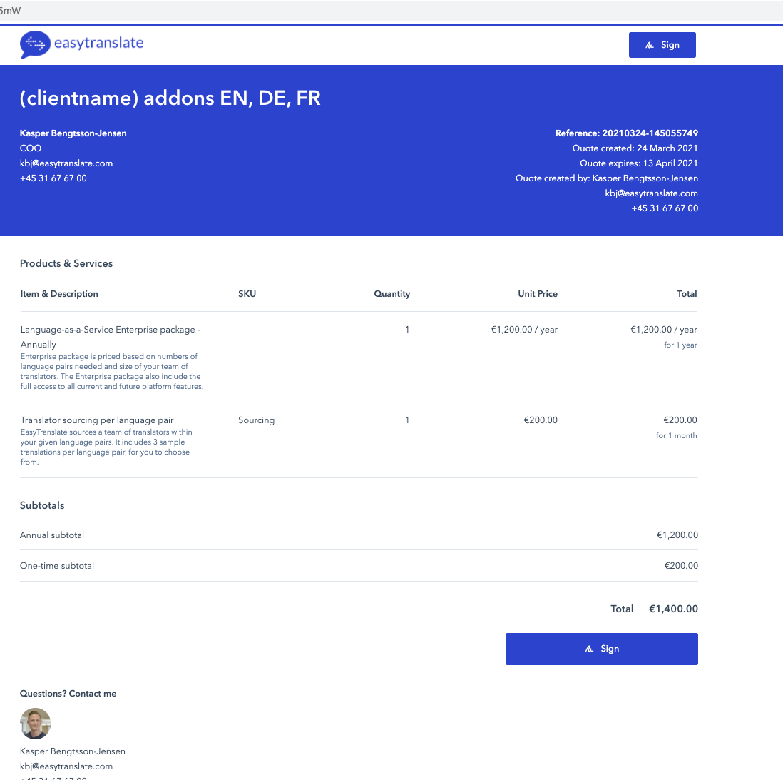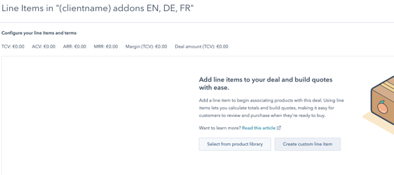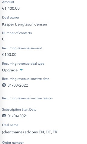 When a client has an existing subscription and wishes to add additional MRR (in the form of additional languages or other services) we need to fill out deal and quote with that billing frequency. For instance, a client wants an extra language at 30 EUR per month on yearly billing, this is a yearly cost of 360EUR. However, when they expand their subscription in this way, they will only pay the cost up to the next billing cycle. For instance if their main subscription has 9 months left, the client will pay 9 x 30 EUR for the additional language they add. The next time their billing cycle occurs, they will pay for their combined subscription, e.g. LaaS subscription + the extra language of 30 x 12 EUR.