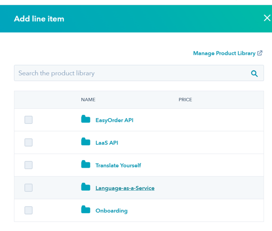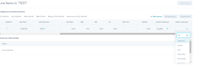 Add the line items you need. Additional language pairs need to be taken from "Language-as-a-Service"; select the "LaaS additional language..." option with the billing frequency you need - always choose annual.