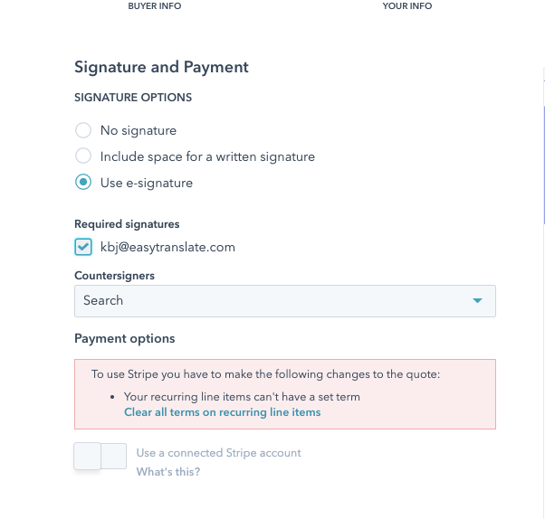 When sending out you need to select the "Use e-signature" option and tick mark the client as "required signatures" (in the screenshot kbj@easytranslate.com is the client)