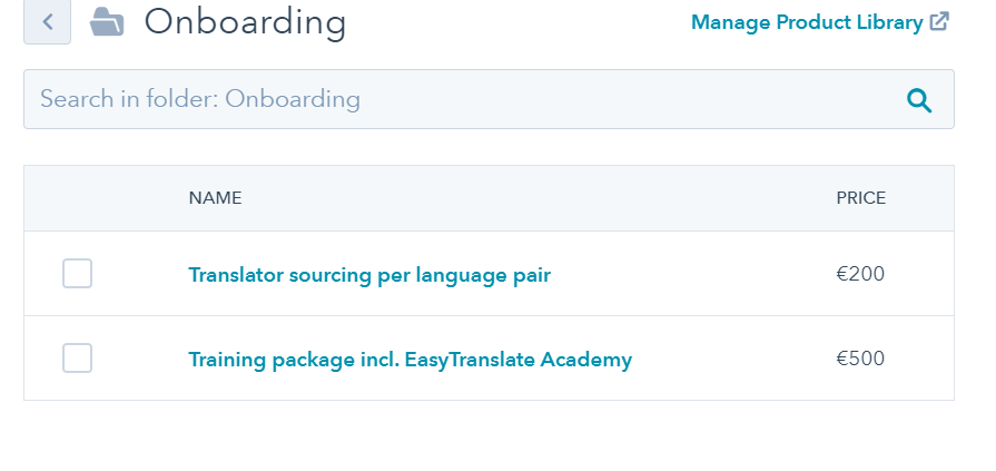 Any one-off onboarding cost line items are selected from the "Onboarding" product library.