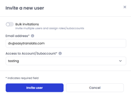 When you switch to Bulk invitations on the top left you have the option to choose Invite One User to Multiple Subaccounts on the left side of the dialog. This lets you assign a user to multiple subaccounts and assign them one or both default roles from the dropdown. The system lets you assign different user roles in each subaccount. Once done click on +Add access to another subaccount to add access to further subaccounts to the invite. Click on Invite users to send out an invitation email.