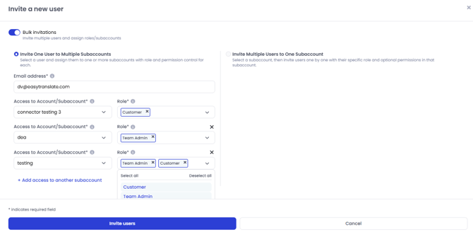 When you switch to Bulk invitations on the top left you have the option to choose Invite Multiple Users to One Subaccount on the right side of the dialog. This lets you add multiple users to a subaccount at once and assign each of them a user role. You can choose one or both default roles from the dropdown. The system lets you assign different user roles for each user. Once done click on +Add access to another user to add the next user. Click on Invite users to send out an invitation email to all users.
