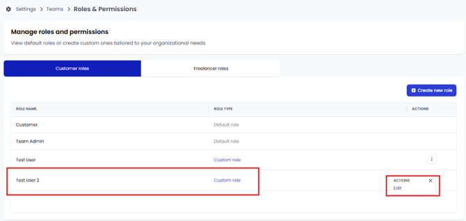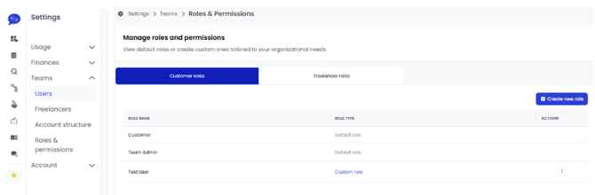 To configure a custom role go to Settings -> Teams -> Roles and Permissions which will take you to the Manage roles and permissions page. This page features two tabs, one to create custom roles and second one for the definition of freelancer roles.